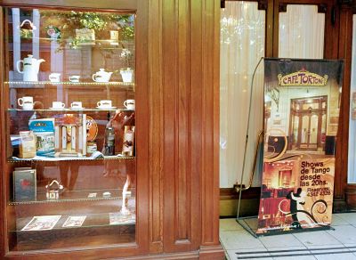 Auf der Avenida de Mayo entdecke ich zufällig das allseits bekannte Café Tortoni mit allerlei Schnickschnack: mit Gemälden ehemals eingekehrter Künstler und Kunstsammler an den samtrot verkleideten Wänden, mit alten schwarz-weiß Fotos gefüllten Glasvitrinen, die berühmte Leute aus Politik und High Society zeigen, die sich hier einmal die Ehre gaben und feine Skulpturen. Selbst ein verzauberter Blick nach oben an die reich verzierte Buntglas- Decke reicht nicht, um die feinen Details dieser im französischen Stil gehaltenen Inneneinrichtung nur mit einem Besuch zu erfassen. Es soll hier auch Führungen geben. Die galanten Kellner lassen gerne ihr traditionsreiches Café fotografieren und tun mir den Gefallen, auch einmal hier abgelichtet zu sein samt einer Einladung in eine Milonga am Abend...nett!