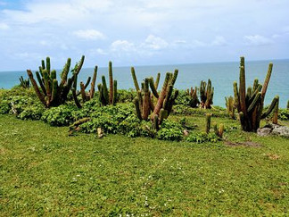 Oberhalb schlängelt sich ein Pfad durch eine Kakteenlandschaft und weiter durch Sandwege hinunter zum Strand, wo sich die Wellen an den Felsbrocken im Wasser brechen.